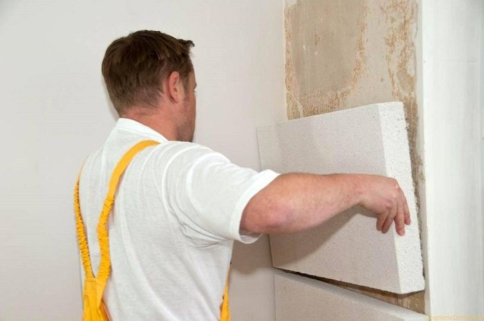 Теперь приступаем к укладке плит пенопласта. Крепление к стене может производиться при помощи дюбелей, клея. Особое внимание нужно уделить дверным и оконным проемам, а также углам дома.